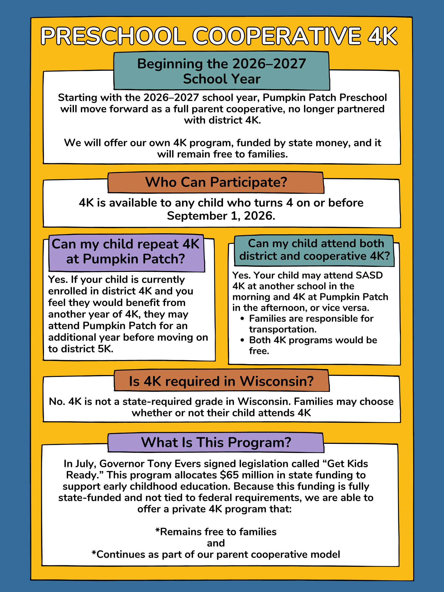 Wrap-around child care is also available before and after preschool, and all day on Fridays when 4K is not held.